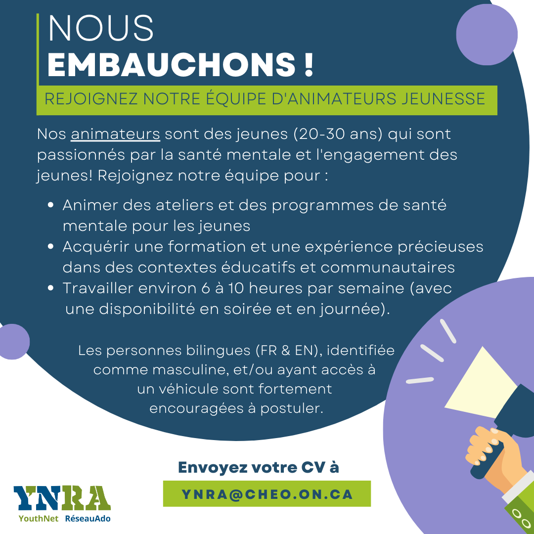 Postulez dès aujourd’hui pour devenir un animateur/trice jeunesse en envoyant votre CV (une lettre de candidature est appréciée également, si vous le souhaitez !!) à ynra@cheo.on.ca.