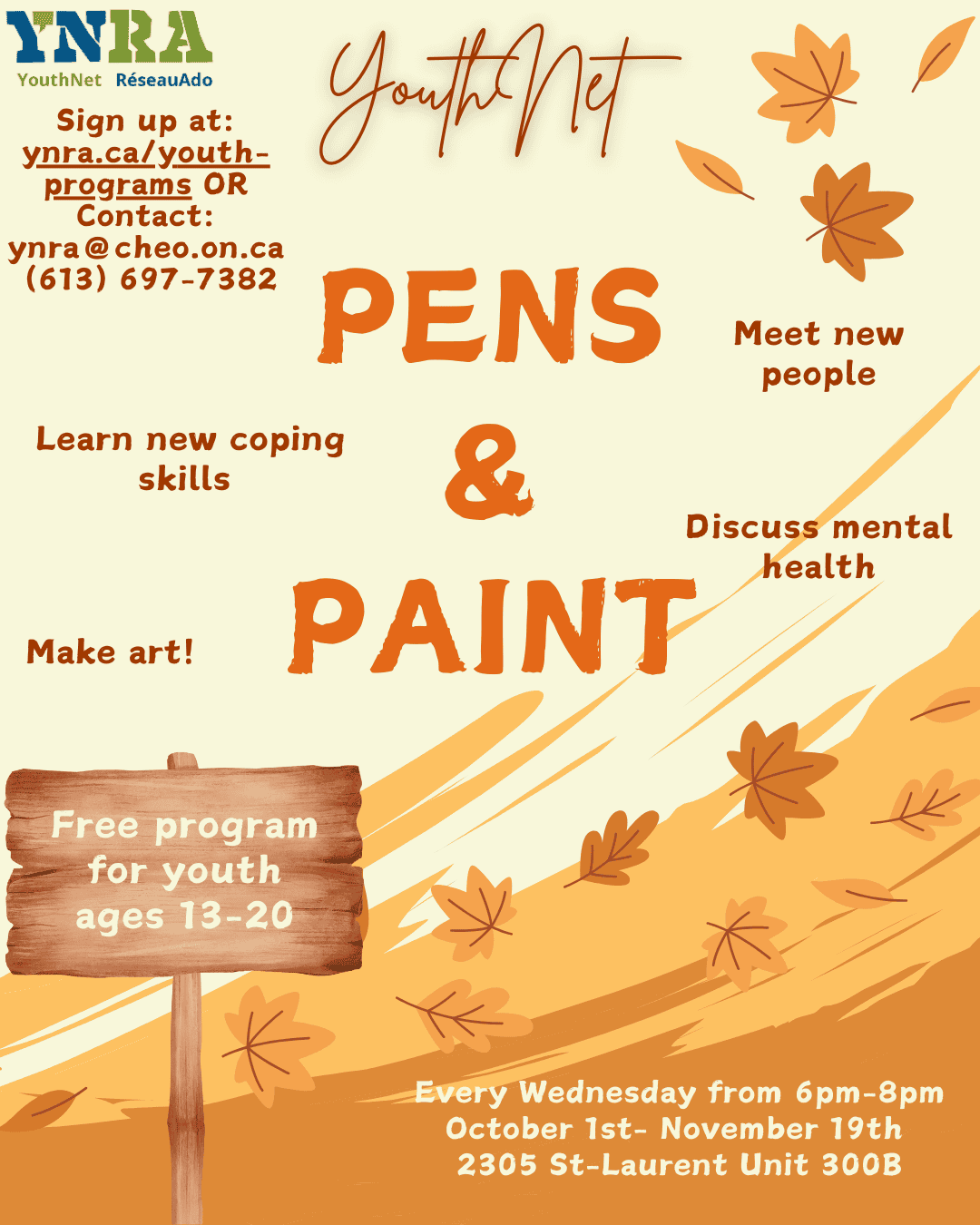 Our Pens & Paint program focuses on using art (and sometimes creative writing activities) to cope with stress and mood. You don’t have to be artsy to join: any youth interested in trying out creative coping strategies is welcome to register! The program offers a secure space to talk about challenges, be creative, connect to others and ultimately try out some cool new art mediums as tools for self-expression and self-regulation!
